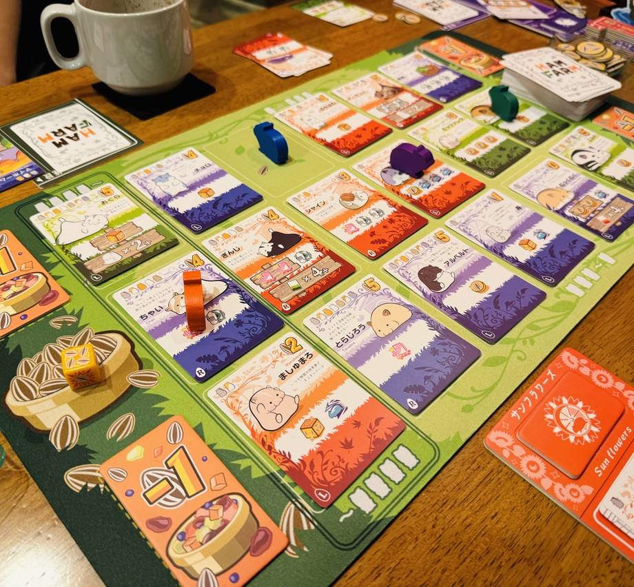 「ファーム」と呼ばれる共通の場で自分のコマを移動させ、お目当てのハムスターカードの近くに来たら「ヒマワリのタネ」を支払ってスカウト(=購入)することができます。