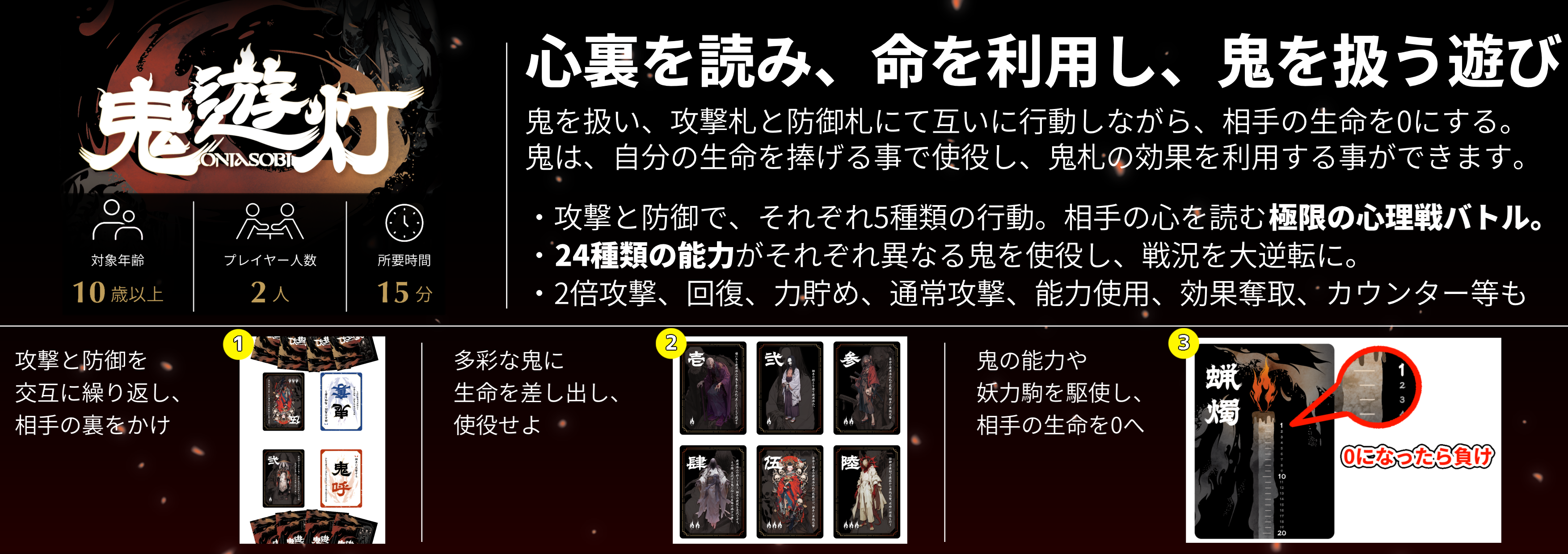 この遊びは、鬼札に書かれている鬼を扱い、攻撃札と防御札にて互いに行動しながら、相手の生命を0にする事を目的とします。