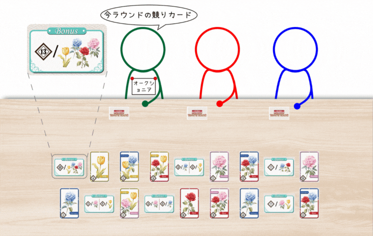 プレイヤーは入札のタイミングを見極め、花やボーナスカードをベストな価格で手に入れ、華やかなセットを集めて高得点を目指します。