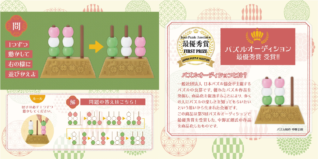 3色のだんごを1つずつ動かして決められた並びに移しかえるパズル!ストンと落ちる感覚がくせになる、インテリアにもおすすめな、かわいいだんごのパズルです。