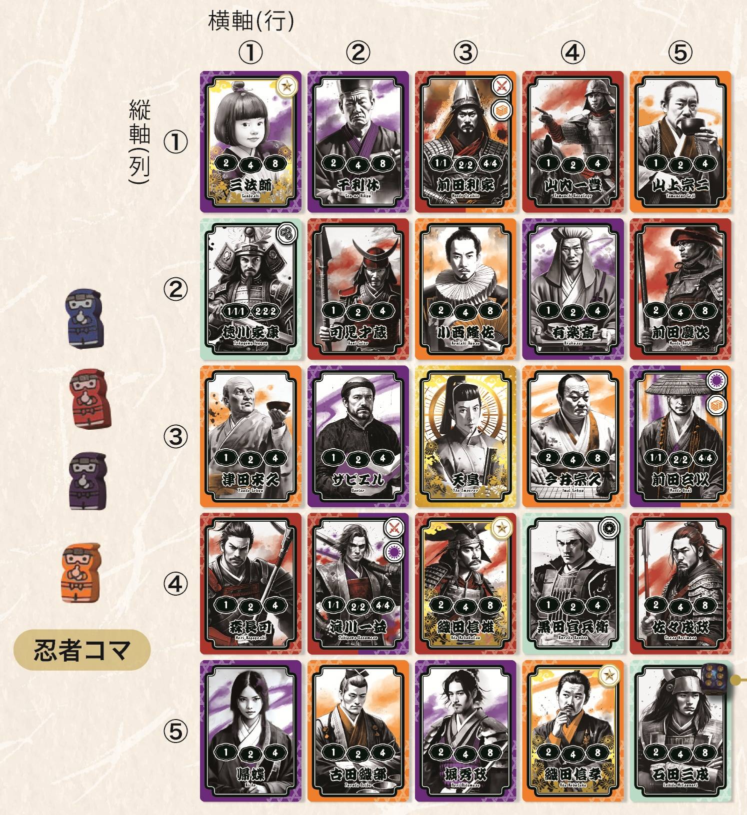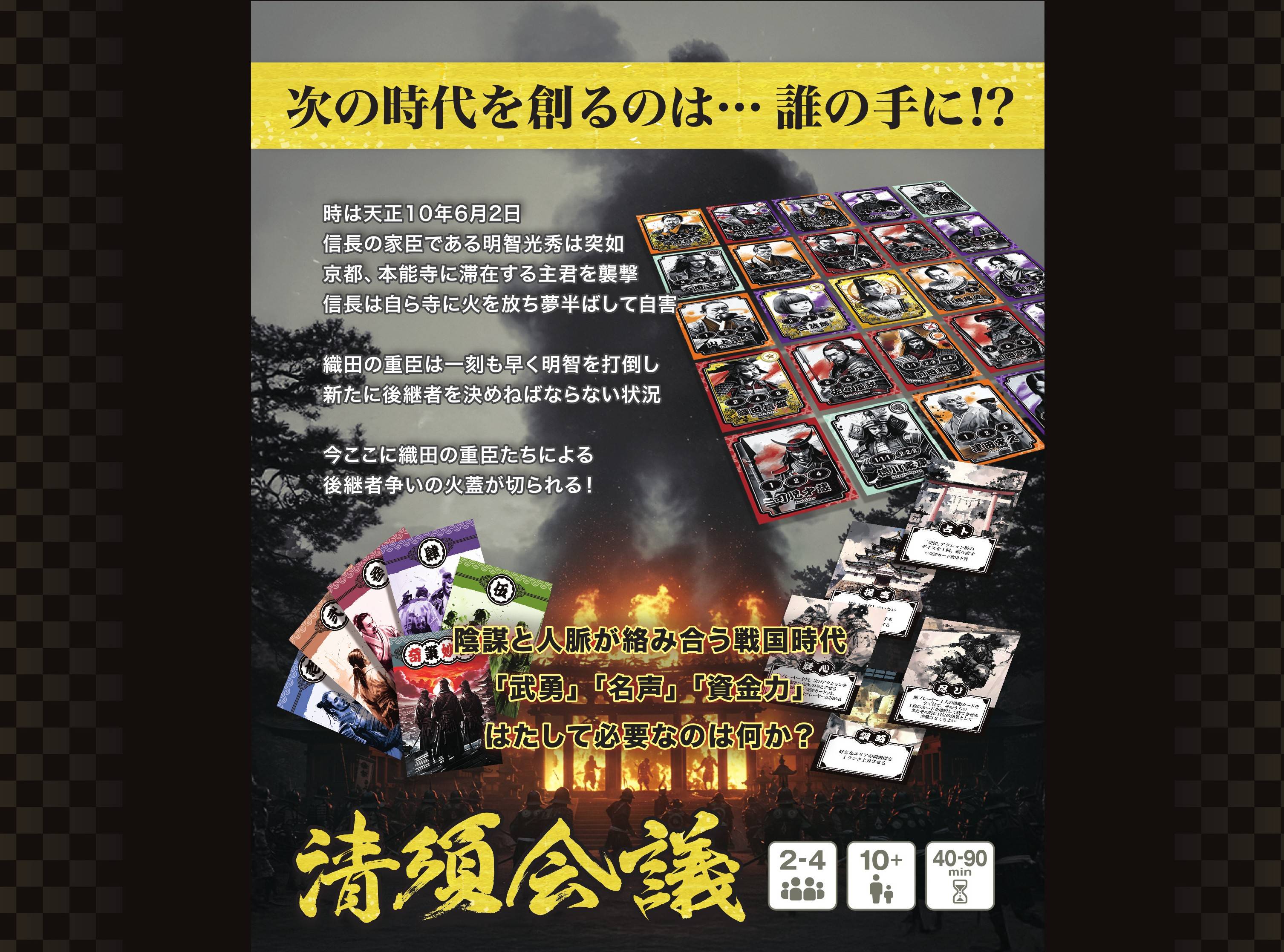 このゲームは、本能寺の変後の織田家を舞台にした影響力獲得ゲームです。プレーヤーは織田家の重臣となり、各地の重要人物(有力者)を味方につけて発言力を高めます。他の重臣たちと後継者の座を争い、誰が信長亡き後の天下を握るのか。策謀を巡らせ、歴史の勝者を目指しましょう。