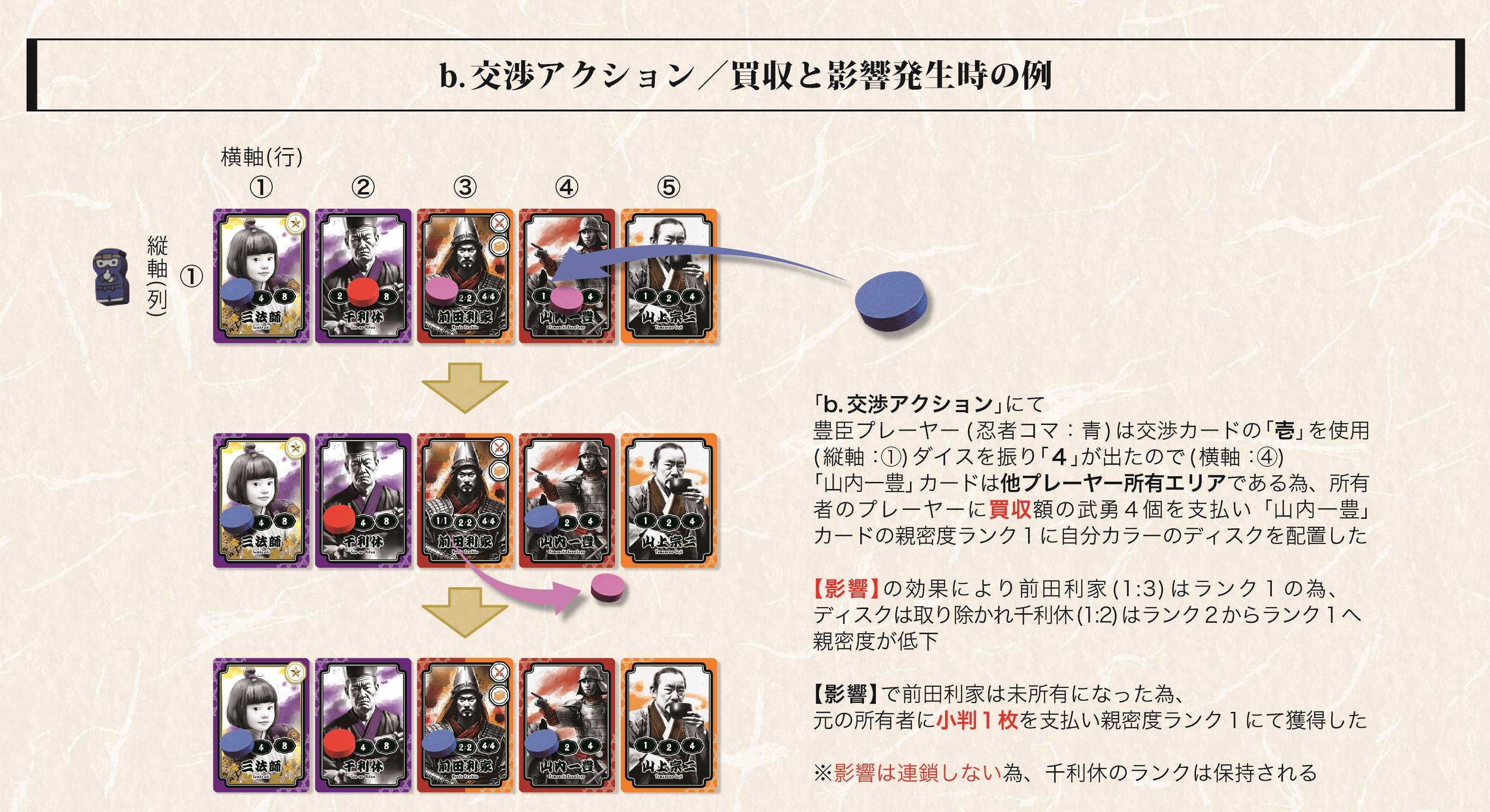 自分の手番では1枚の「交渉カード」および「奇策妙計カード」を使用し