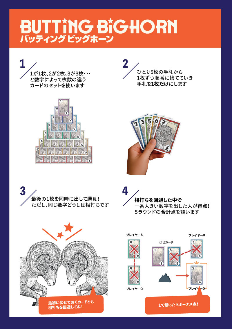 - 5枚の手札を1枚ずつ捨てていき、最後に残した1枚の数字で勝負!いちばん大きい数字を出した人の勝ちです。