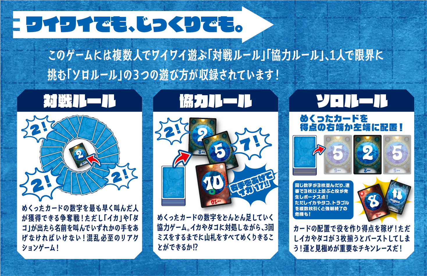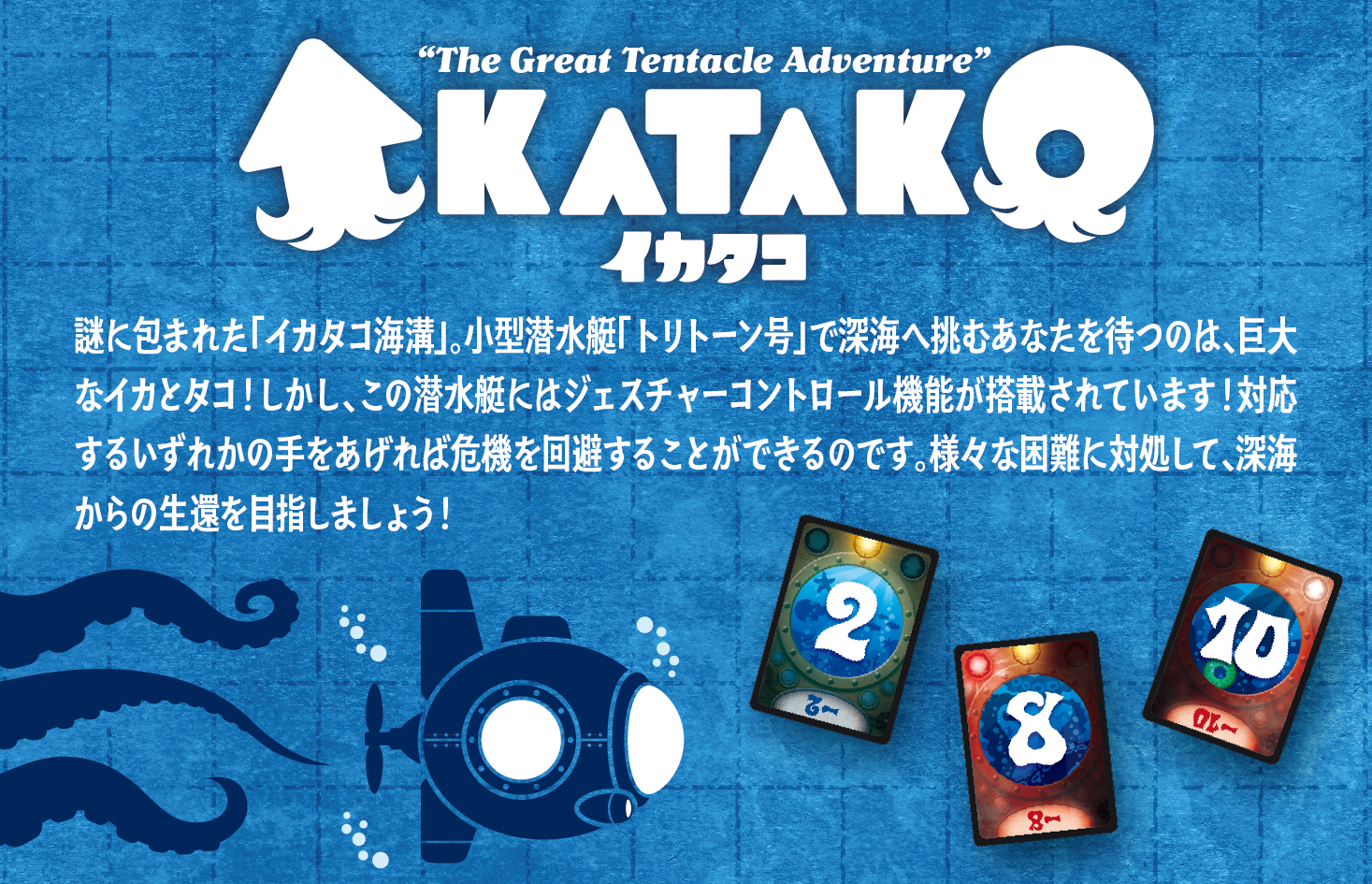 - めくられたカードに正しく反応し、できるだけ多くの得点を集めて生還を目指す潜水系リアクションゲーム! 謎に包まれた「イカタコ海溝」。小型潜水艇で深海へ挑むあなたを待つのは、巨大なイカとタコ!彼らが現れたら、迷わずにいずれかの手をあげて回避しましょう!