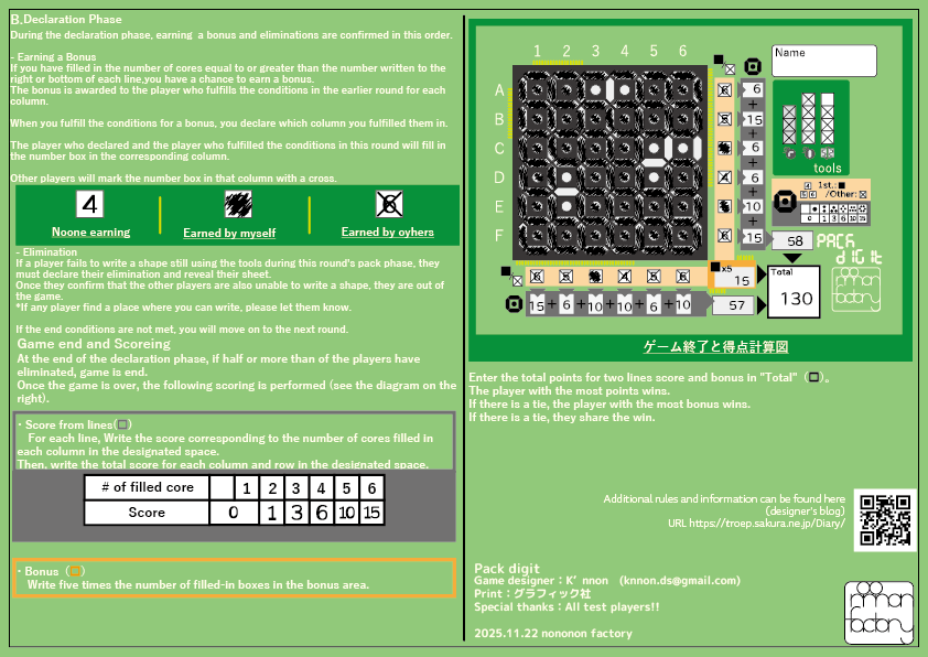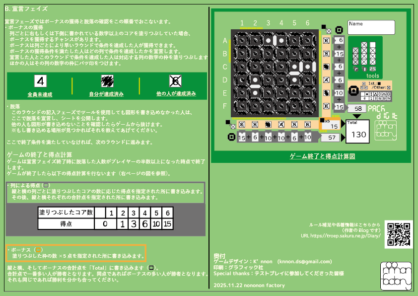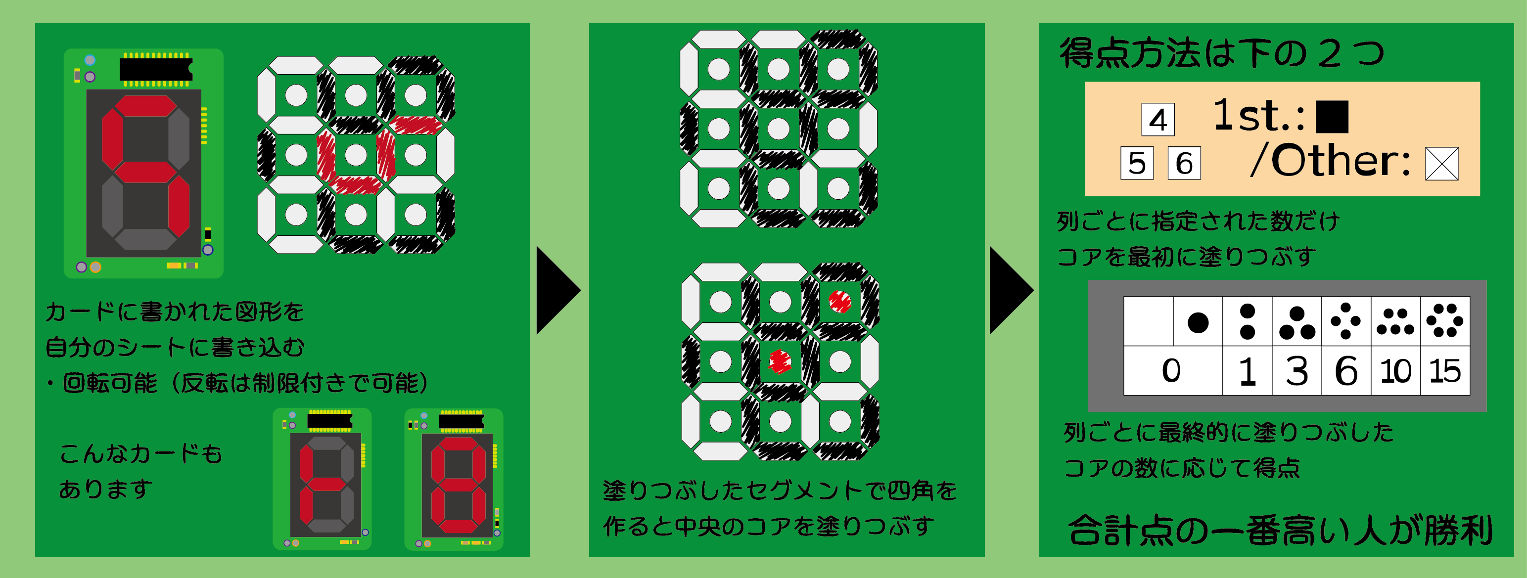 ゲームが終了したら列ごとに塗りつぶせたコアの数を点数に換算し、ボーナス点を加えた合計点最も高い人が勝者となります。