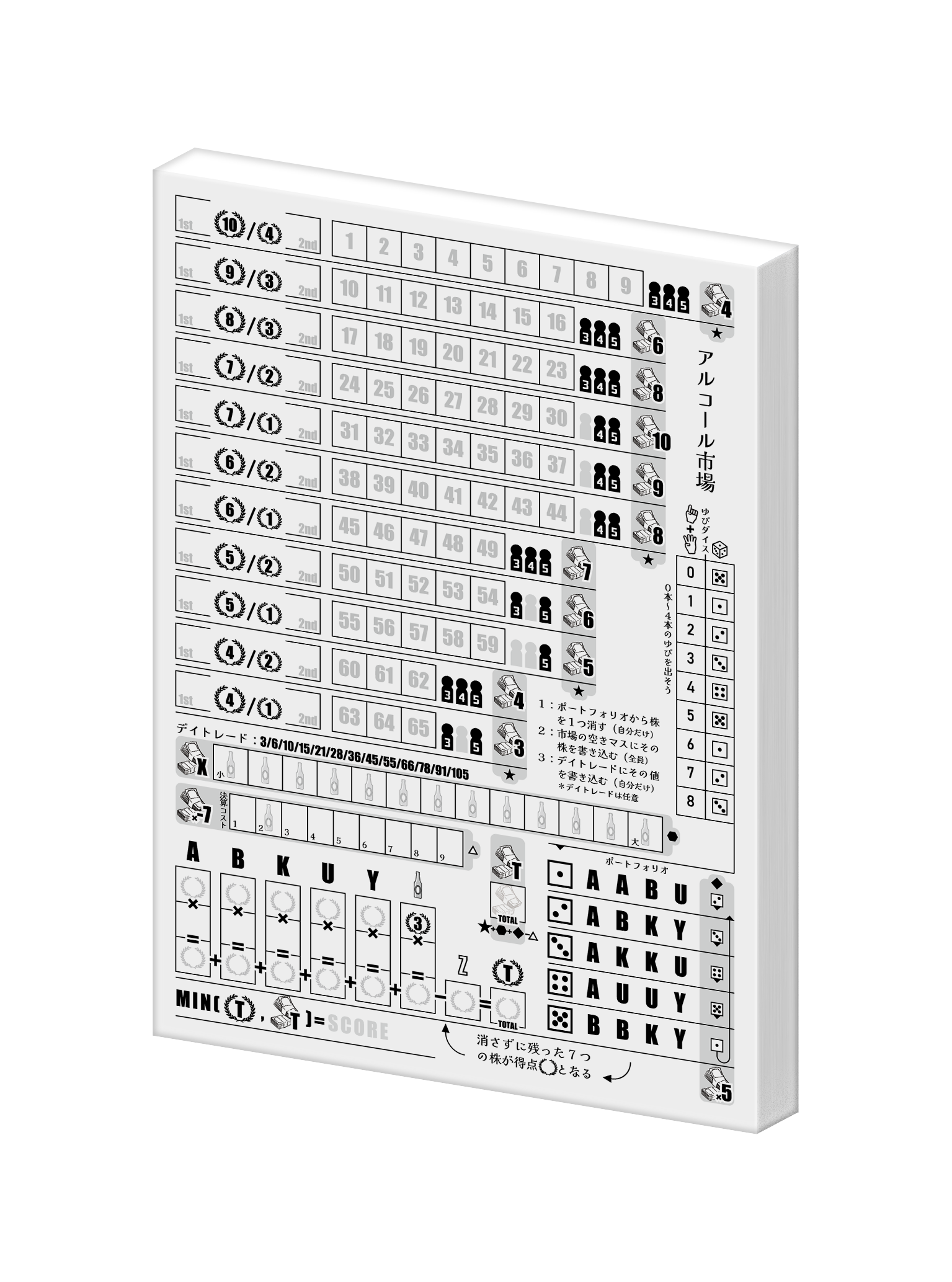 一方、投資家としてデイトレードによる資金調達も怠れません。市場に投資する度、そのマスに書かれた数字を自分のデイトレードの成果として専用の欄に書き込んでいきます。これが右肩上がりの大儲けに……つまり左から右へ、昇順になるようにうまく並べろというわけです。そしてゲームの得点は、手持ちの株の株価とデイトレードで稼いだ資金の……少ない方なんですね!何もおろそかにはできません。