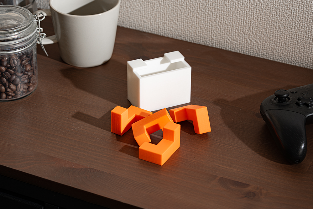 - 同型の4ピースを入り口が一部塞がれた箱に入れます。