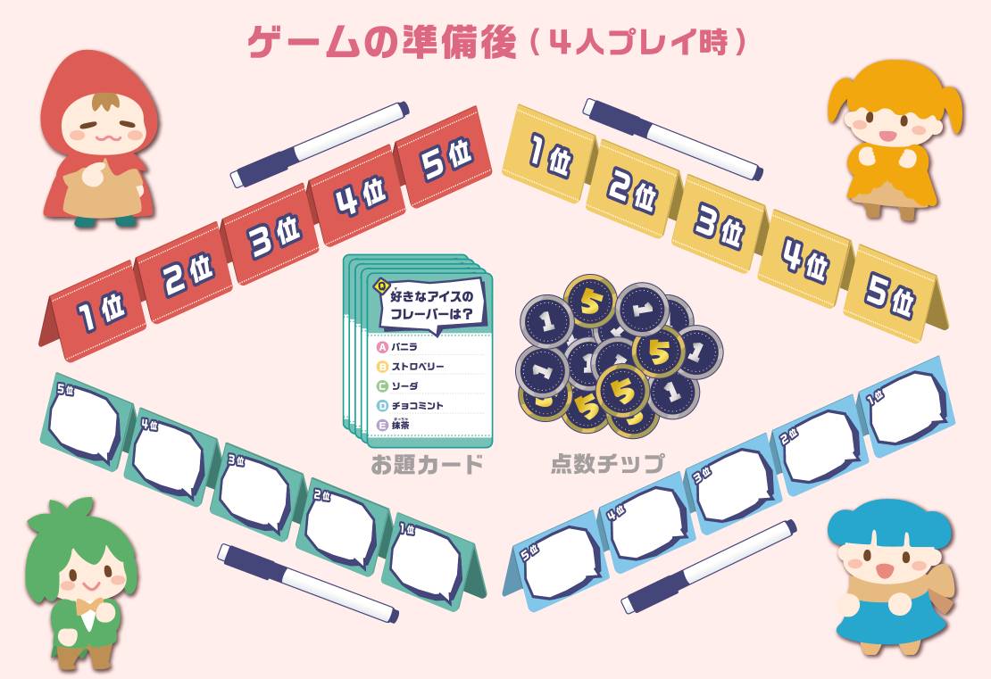 みんなの価値観や好みを予想して当て合う、コミュニケーションゲームです。
