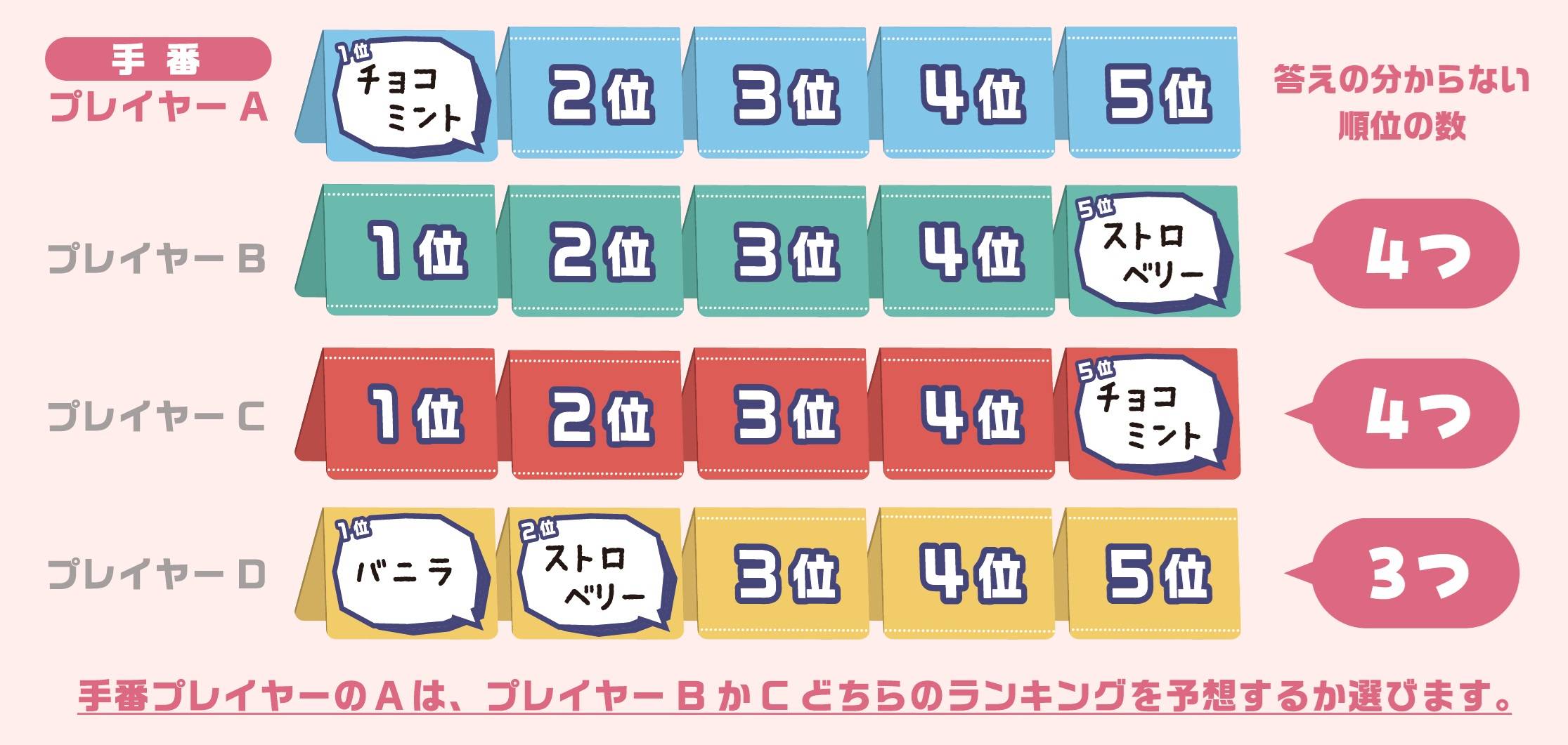 その際、ランキングが最も公開されていない(答えの分からない順位が一番多い)プレイヤーの中から1人を選んでください。