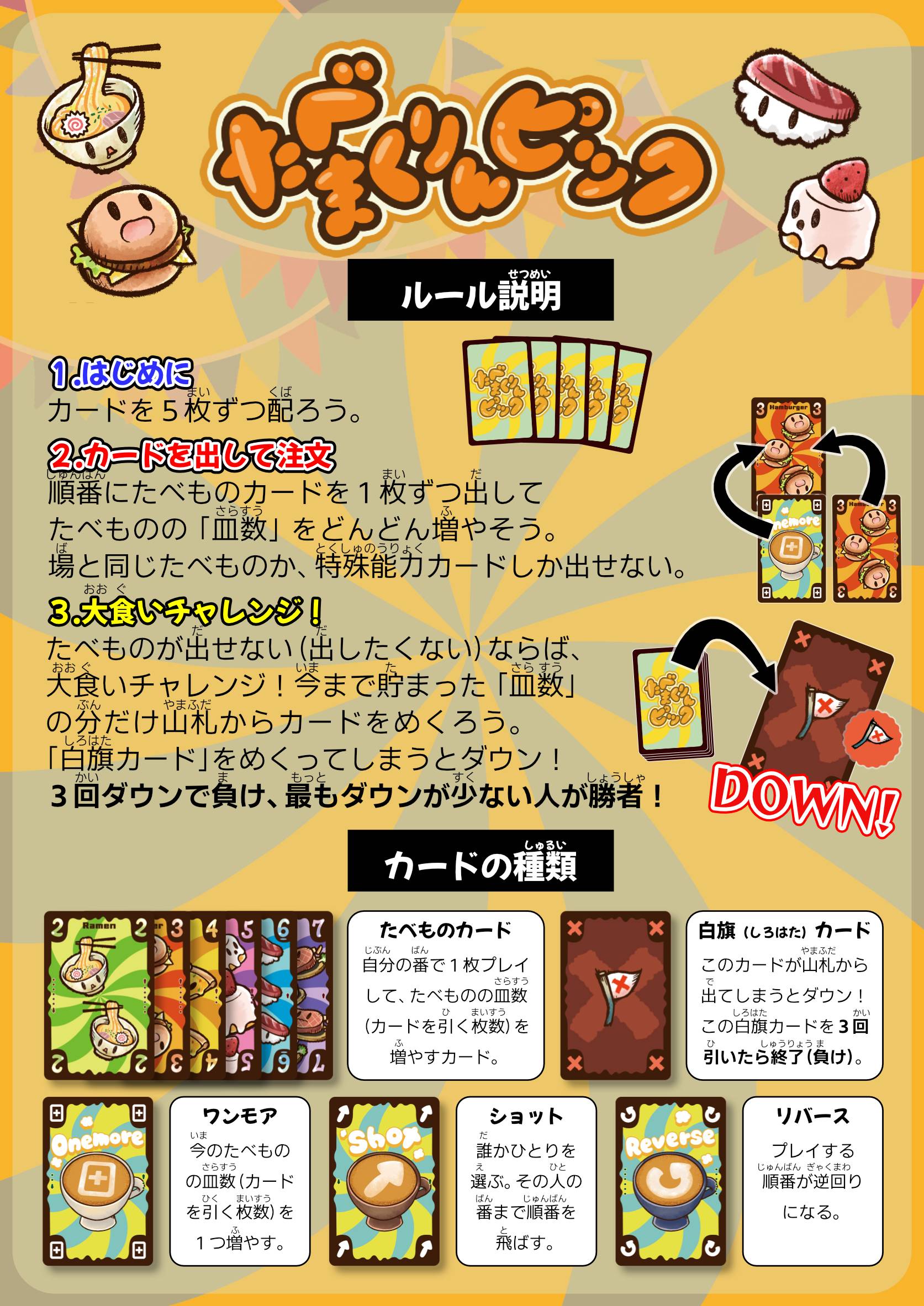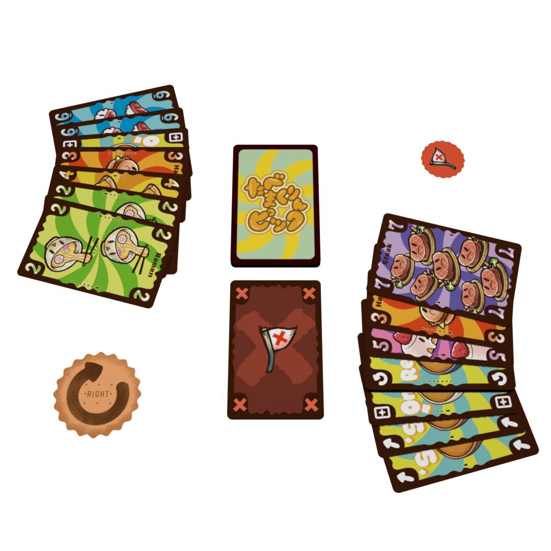 食べ物カードで山札から引く枚数を増やしたり、特殊効果を持つカードを駆使したりして、ライバルに白旗カードを引かせましょう!