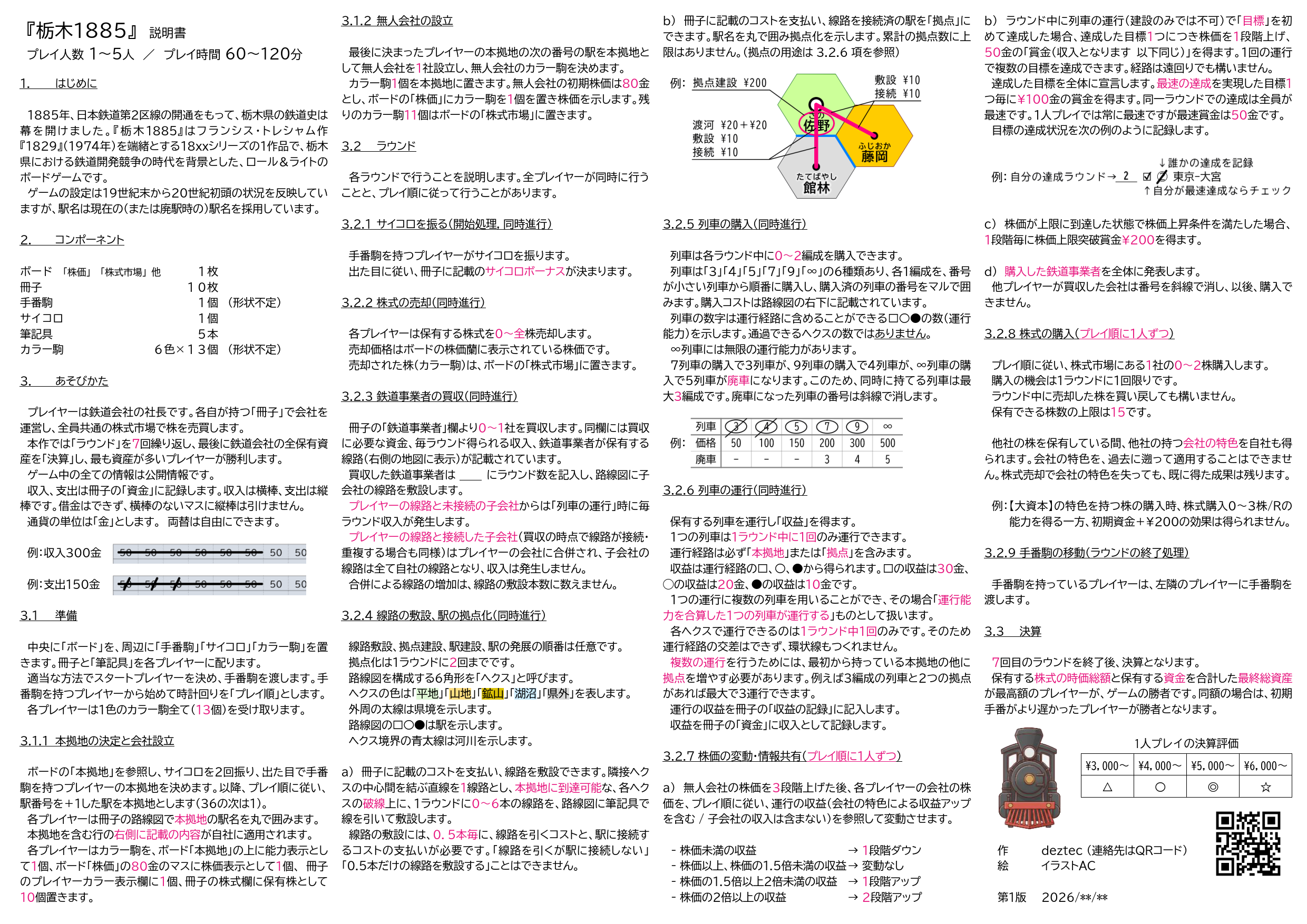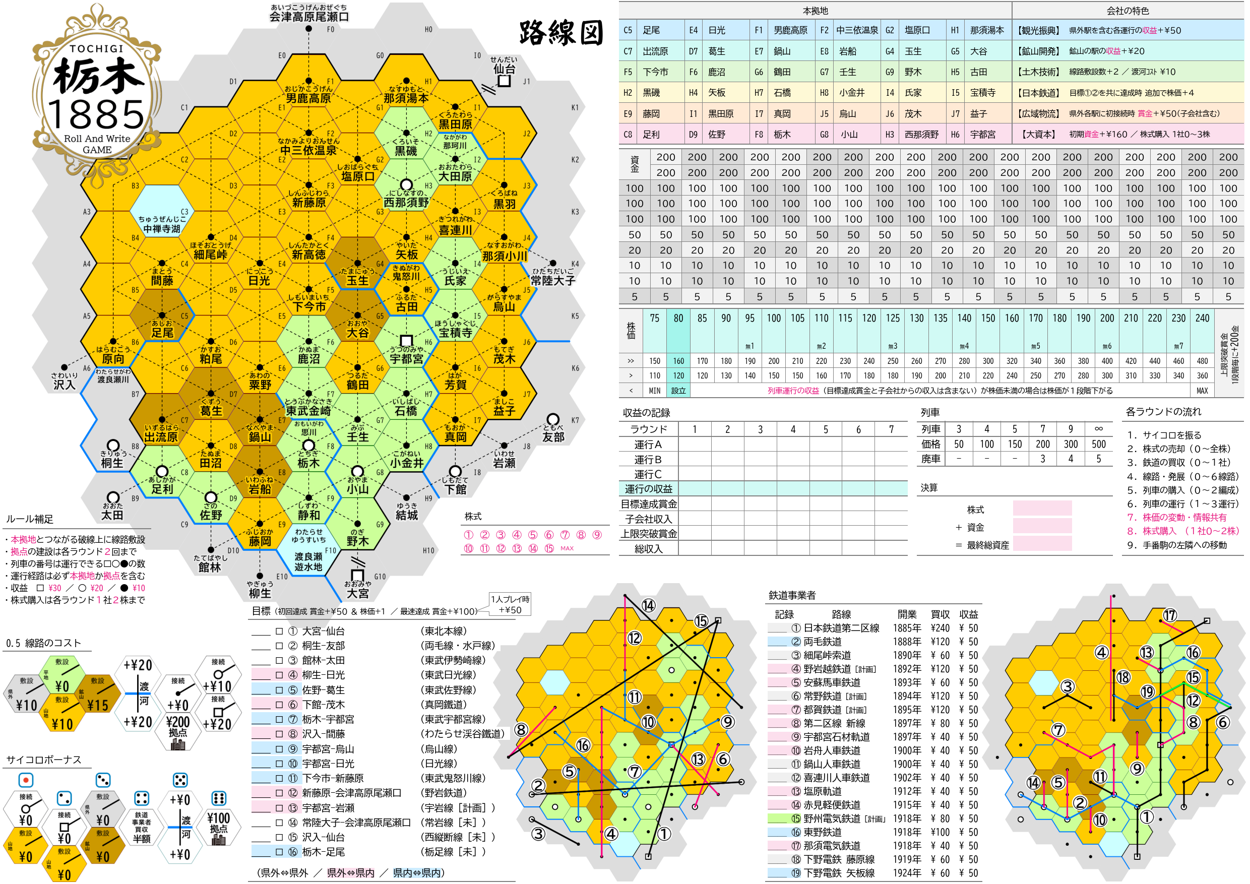 『栃木1885』は、19世紀末~20世紀初頭の埼玉県を舞台として、鉄道会社を大きく発展させ資産を増やしていく 18xx の紙ペンゲームです。18xx では異例のソロプレイに対応しています。