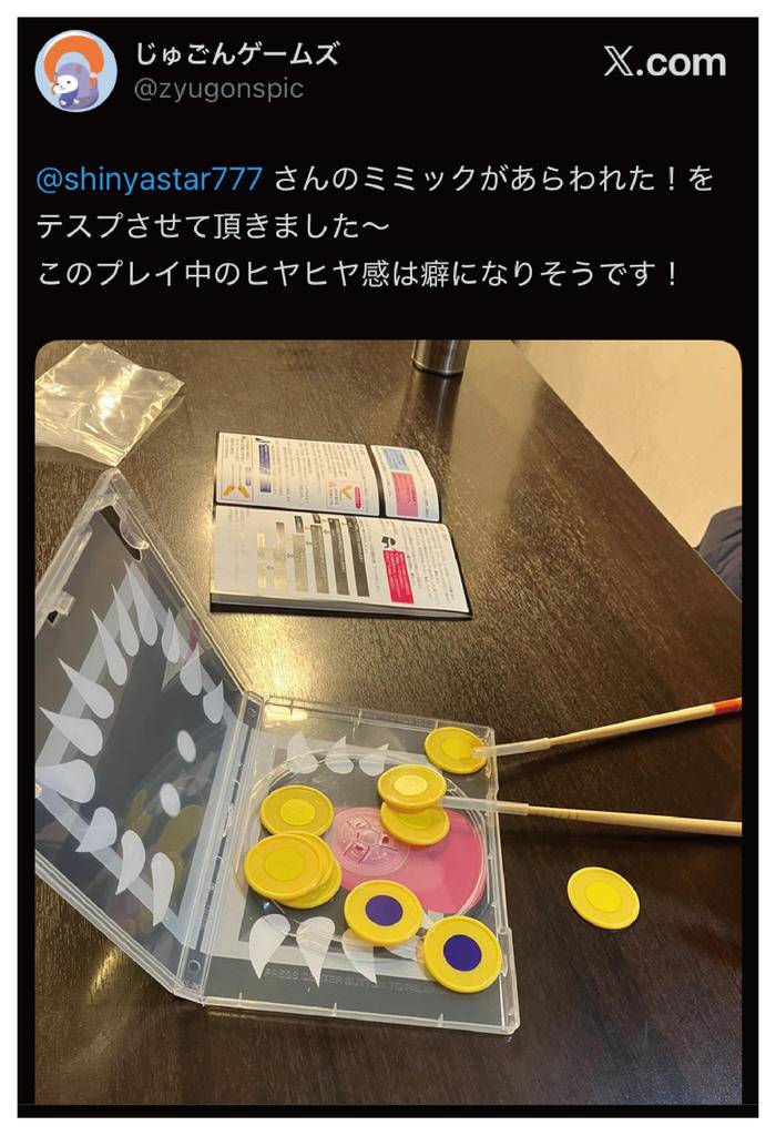 ケースの中には、メダルに擬態したモンスターが潜んでいます。これを取りだしてしまうと、盗賊の負けになるので、ケースの中でメダルをひっくり返す必要があります。運が良ければモンスターに遭遇することなくメダルを取ることもでき、完全な実力勝負ではない「揺らぎ」が起きます。 - 【説明書】