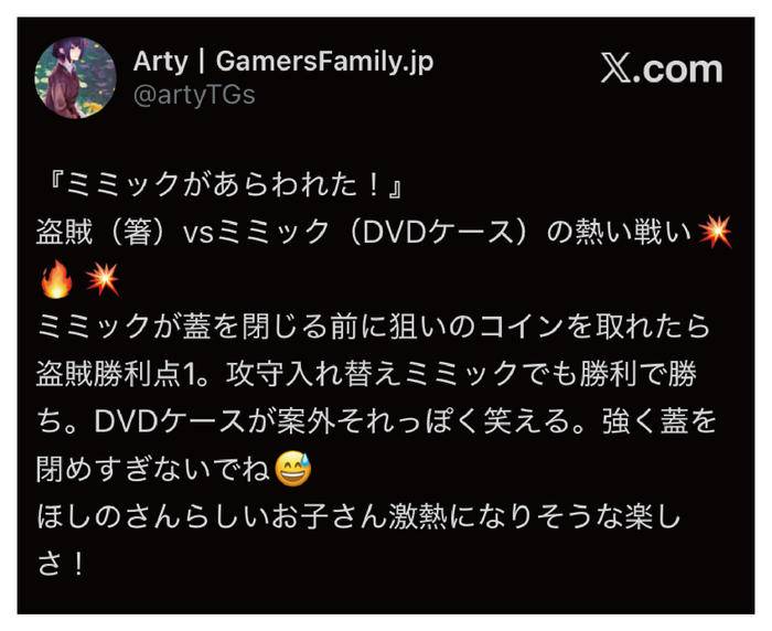 ミミック役と盗賊役に分かれて遊ぶ、心理戦とアクションが混然一体となった対戦ゲームです。非電源ゲーム「黒ひげ危機一発」「イタイワニー」などのドキドキ感に加え、対戦ゲームならではのプレイヤー同士の駆け引きが発生します。