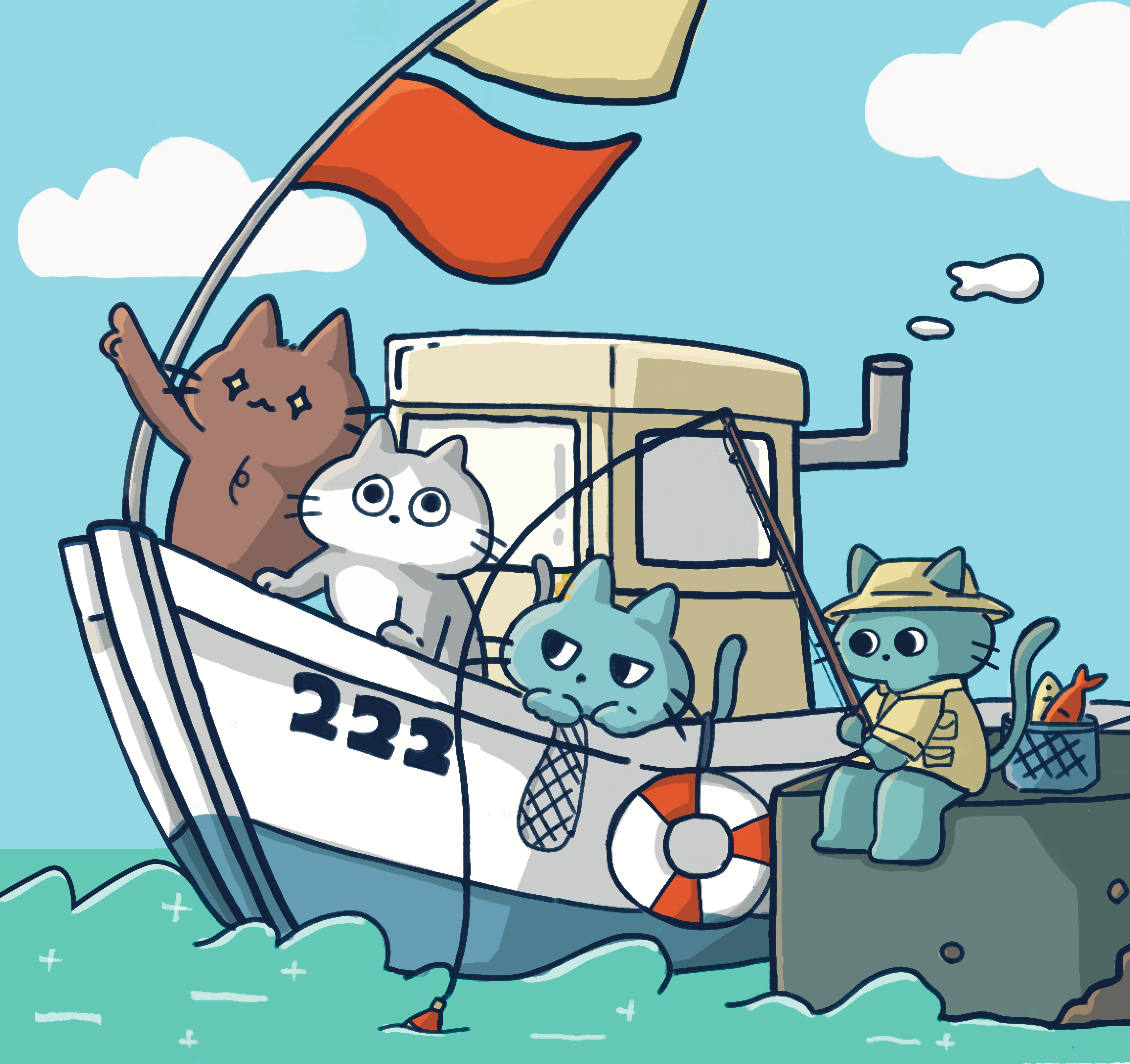 そのひとことから、ねこたちの賑やかな釣り勝負が始まりました!