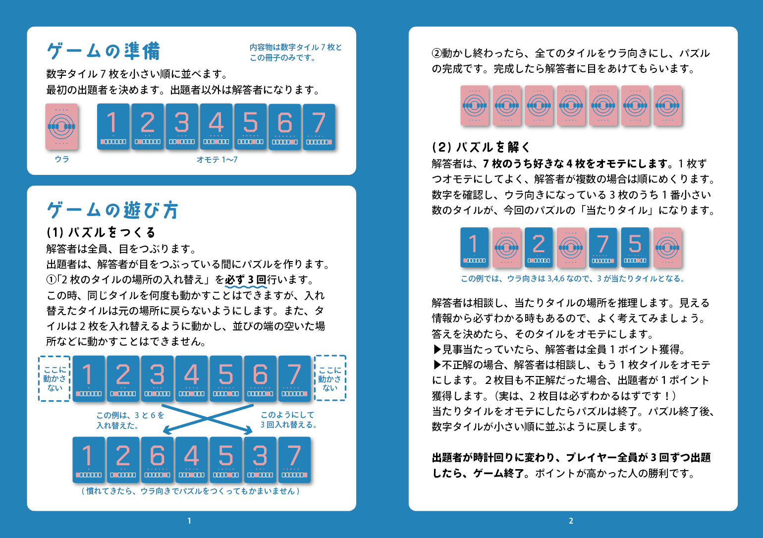 1から7までのタイルを出題者が3回だけ入れ替えを行うことで、パズルを生成。解答者は、好きな4枚をオモテにし、残りの3枚の中で一番小さい数字のカードを当てます。しっかり考えることでわかることも多いです。