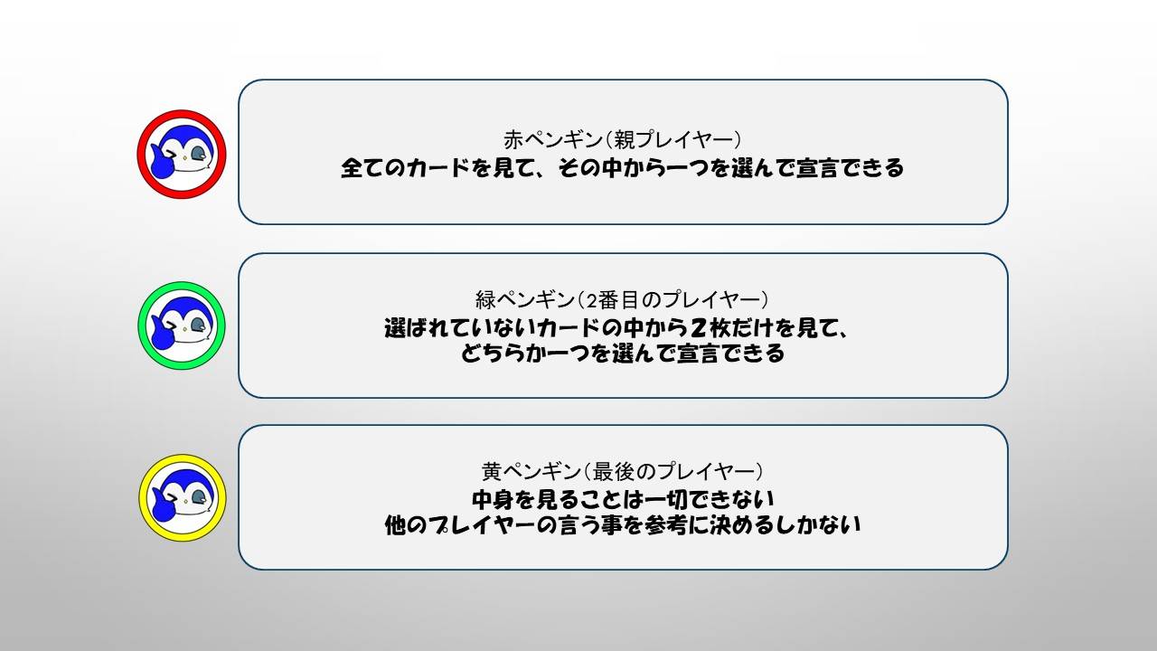 → カードの内容を見ずに、宣言されたカードにチップを置く