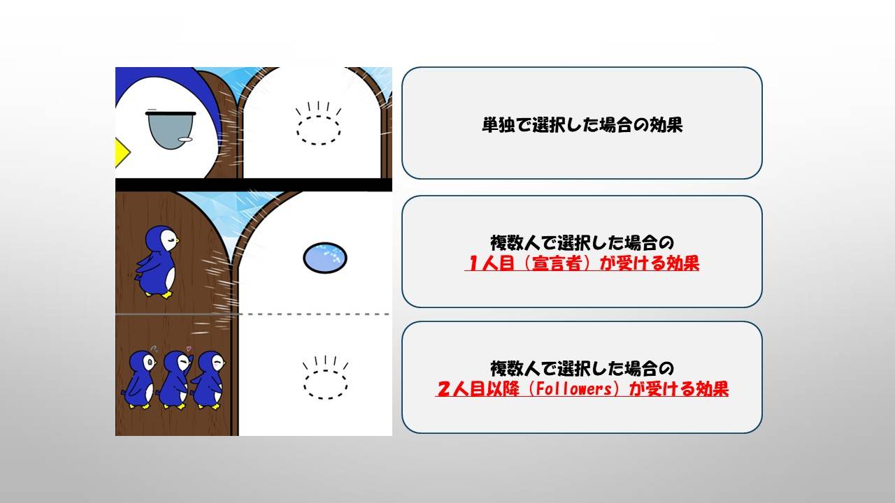 - 複数人 → 立場によって効果が変わる(1人目は2段目、2人目以降は3段目の効果)