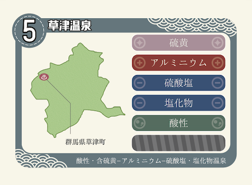 よって、草津温泉の泉質は「酸性・含硫黄ーアルミニウムー硫酸塩・塩化物温泉」となります。