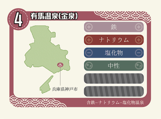 例えば、温泉カードが「有馬温泉(金泉)」であれば、「鉄」「ナトリウム」「塩化物」「中性」という4つの泉質の要素が書かれています。