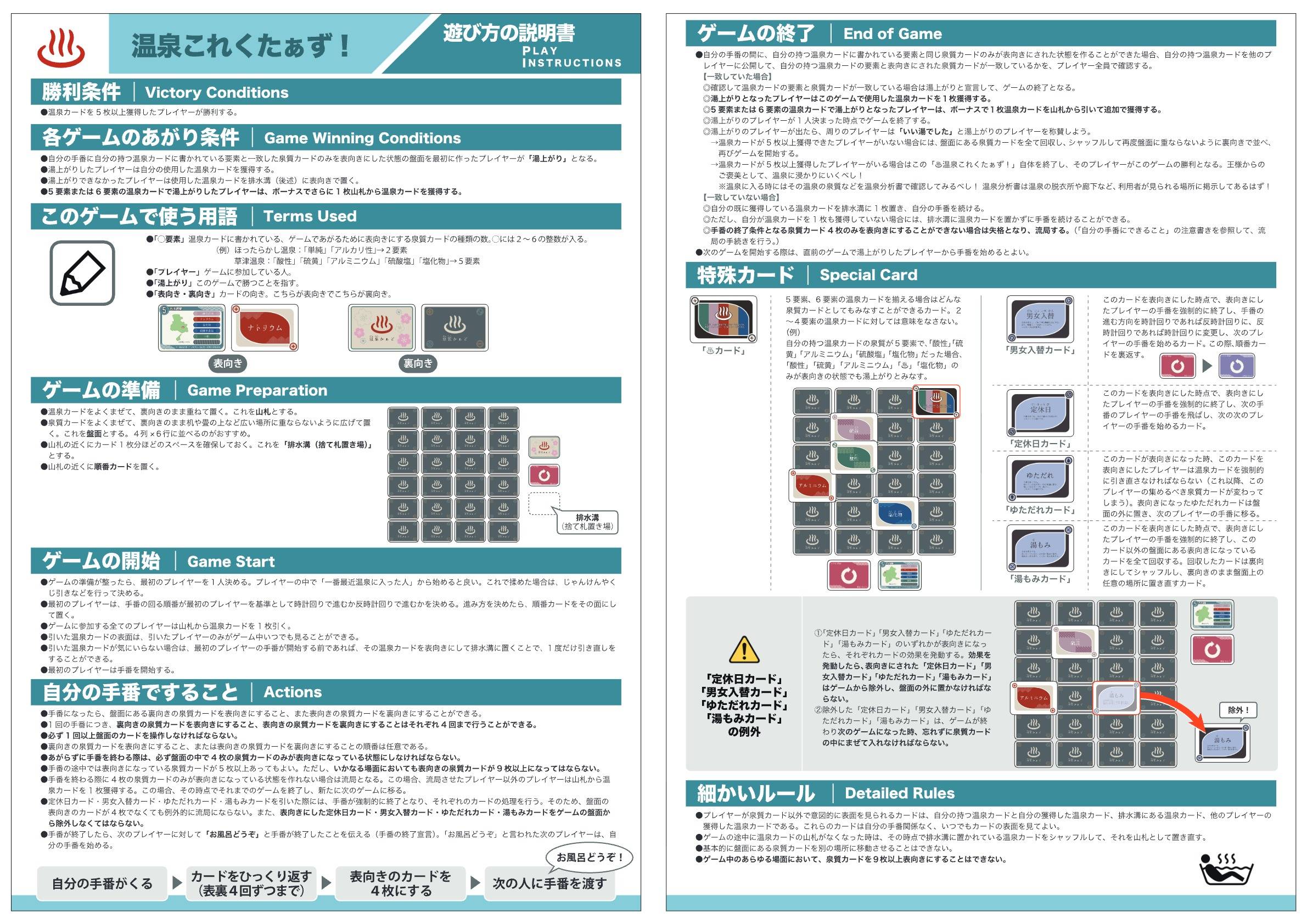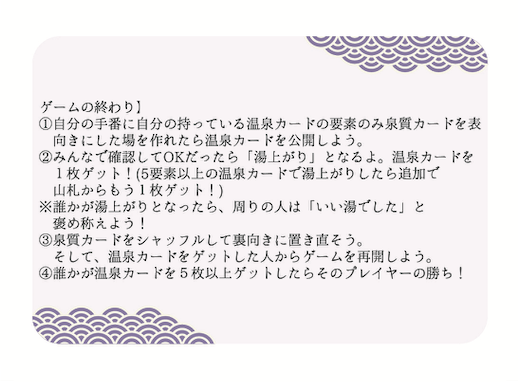 - 実際に日本にある温泉を題材に、お題通りの泉質を一番早くそろえて温泉カードをゲット!5枚ゲットしたら勝利!