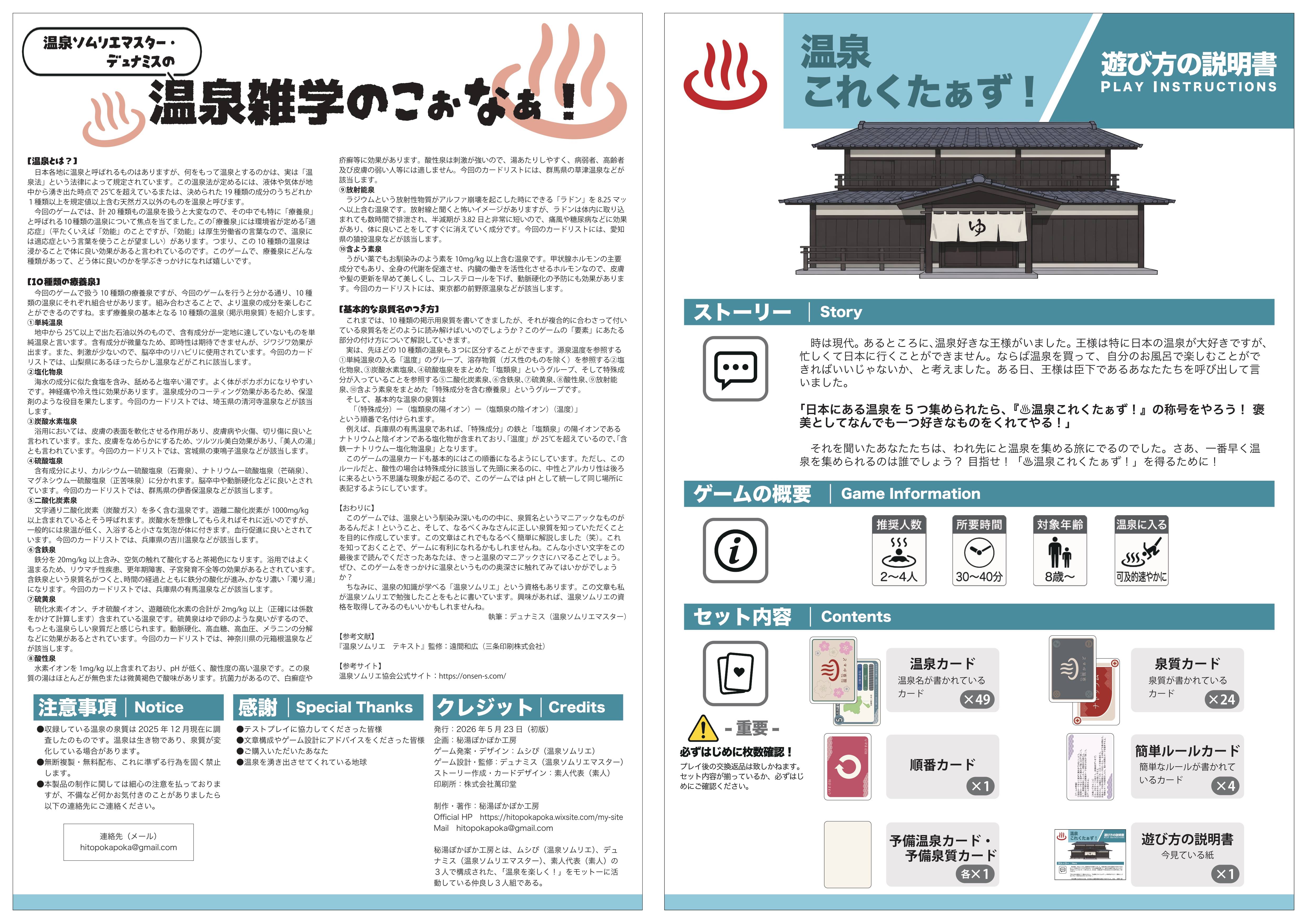 | ゲームデザイン | デュナミス(温泉ソムリエマスター)・ムシぴ(温泉ソムリエ)・素人代表(素人) | イラスト・DTP | ムシぴ(温泉ソムリエ)・素人代表(素人) |