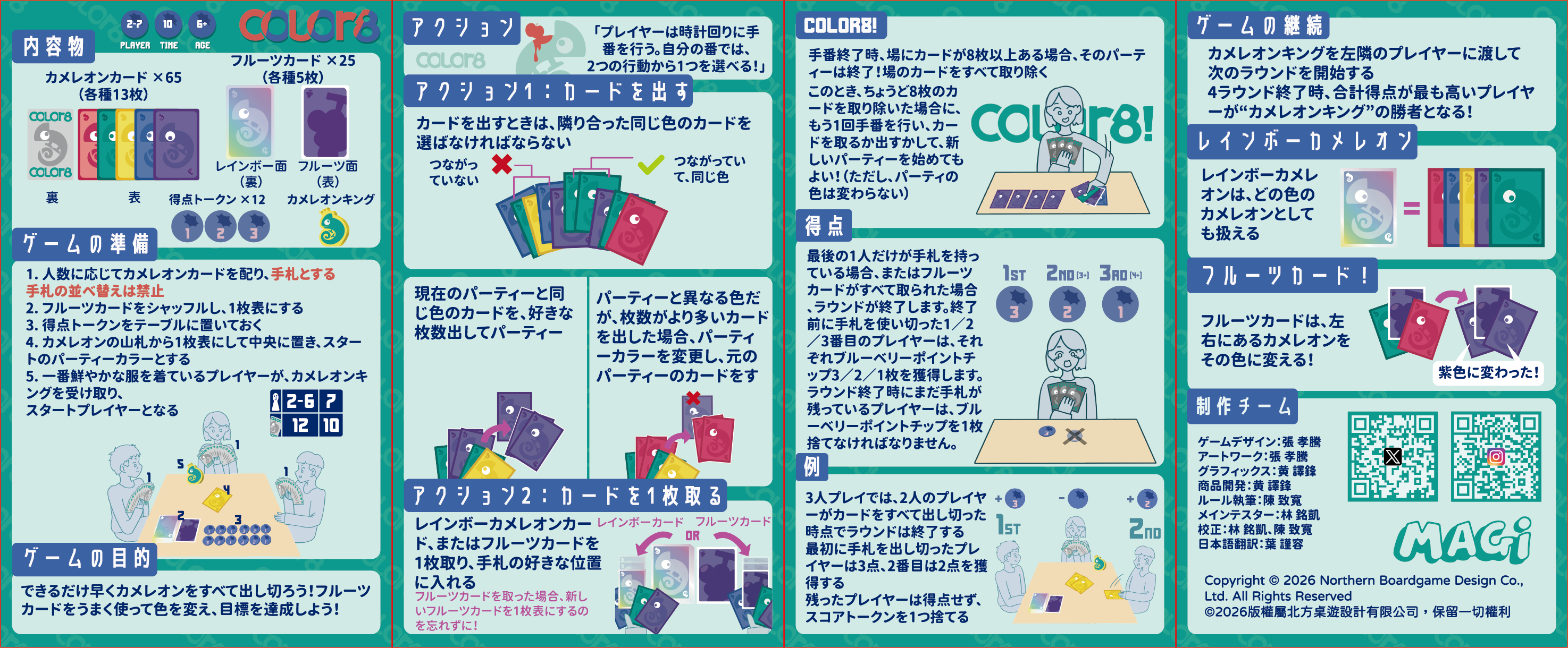 フルーツカードを使って色を変えたり、万能カメレオンを場に出すことで、状況を一気に有利にすることができます。 同じ色のカメレオンを8体揃えると追加行動が可能となり、テンポの良い連続プレイが楽しめます。