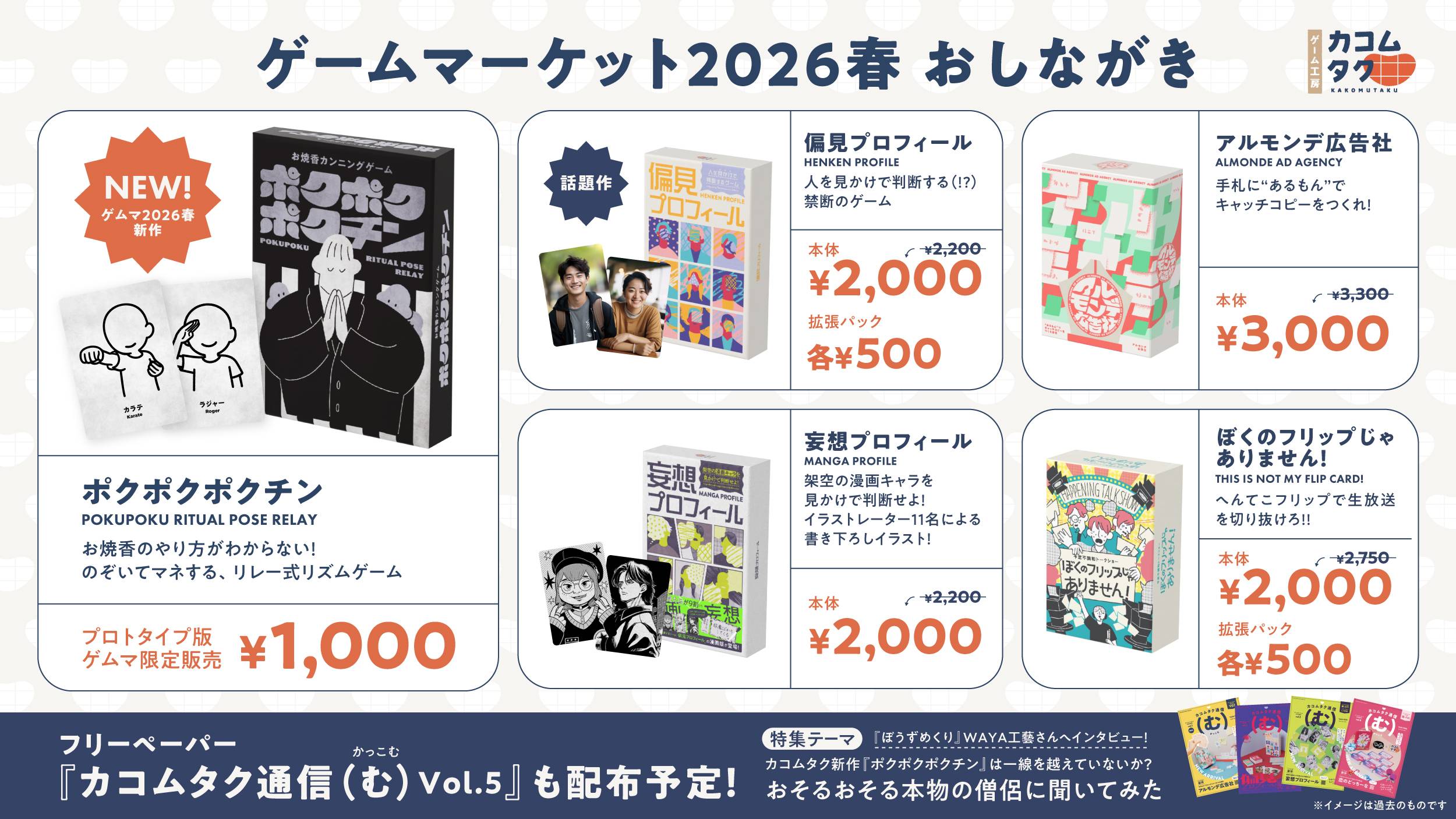 📢ゲームマーケット2026春ではゲーム工房カコムタクの過去作も販売いたします!お得な特別価格となっておりますのでこの機会をどうぞお見逃しなく!!