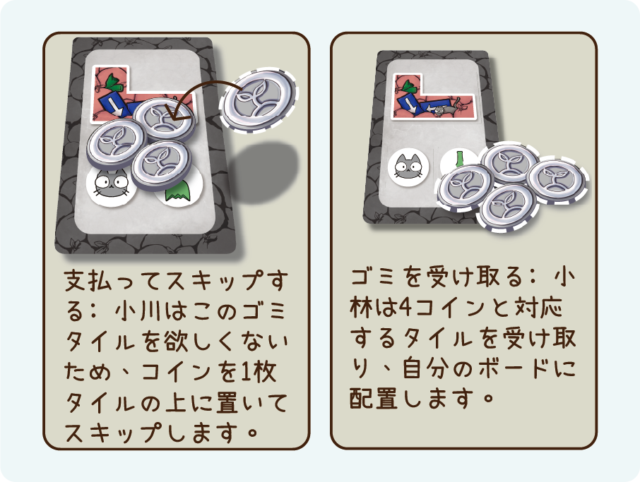 同じ色のゴミタイルを獲得した場合、即座に自分の個人ボード上の同色のゴミタイルの数に応じて、金貨供給スタックから相応の数の金貨を獲得します。 金貨の機能は基本ゲーム内では銀貨と同じですが、金貨モジュール内ではゲームの終了時に計算方法が変更されます。