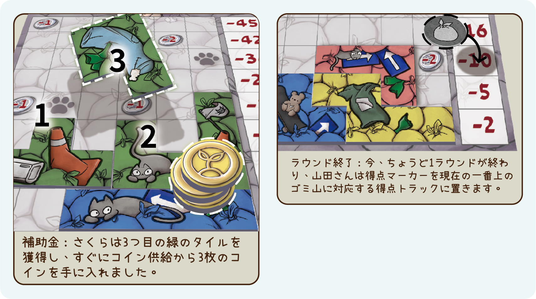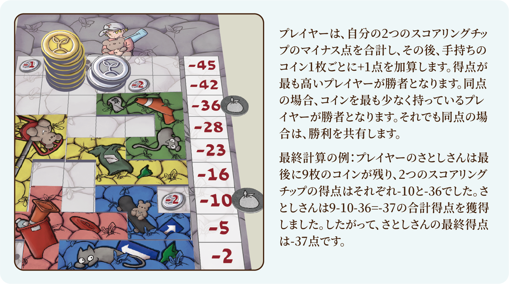 最終的に、すべてのゴミが処理されるか、指定されたラウンド数に達するとゲームは終了します。プレイヤーは集めたゴミと残りの資源に基づいてスコアリングを行い、最もスコアの高いプレイヤーが勝者となります。