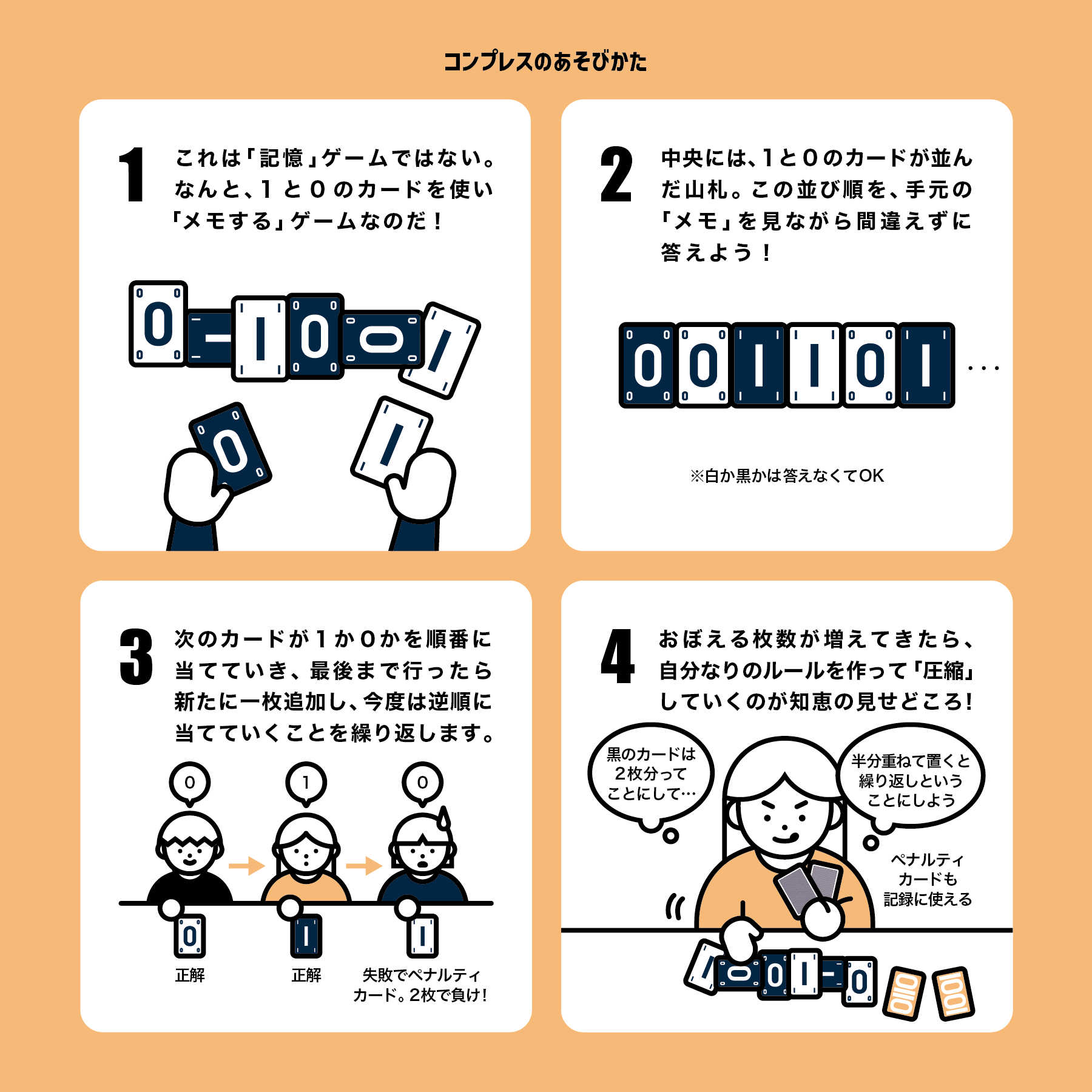 - 無限に続く1と0。その並びを正しく答えられなければ、生き残ることはできない。けれどあなたは気づく。覚えるのではない、記録すればいいのだ、と。手元にあるのは、たった8枚のカード。どう使えばより多くの情報を残せるのか。 記憶に頼らず、思考で整理し記録する。これは「覚えるゲーム」ではなく、「記録するゲーム」なのだ!