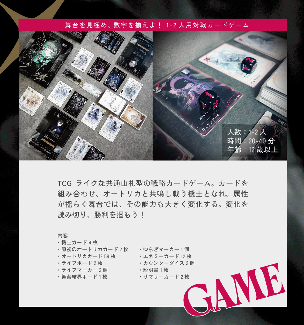 カードを組み合わせ、オートリカと共鳴し戦う機士となれ。属性が揺らぐ舞台では、その能力も大きく変化する。変化を読み切り、勝利を掴もう!