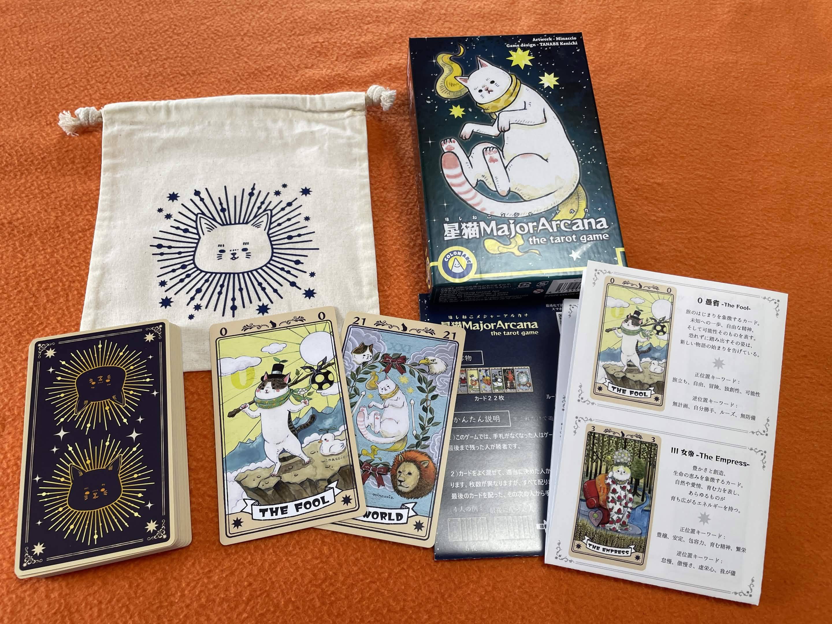 タロットカードの他、収納用の巾着、個々のカードの解説と意味が書かれたシートが付属します。