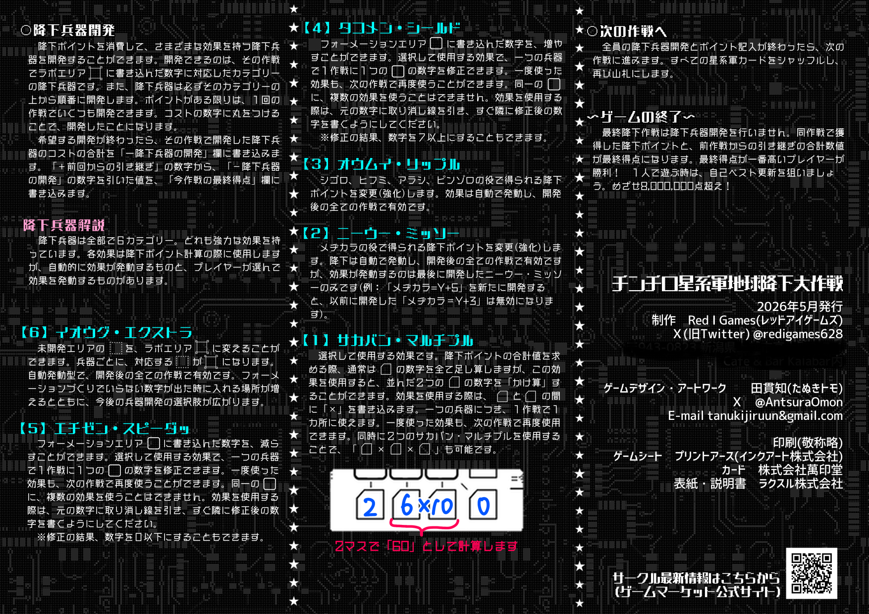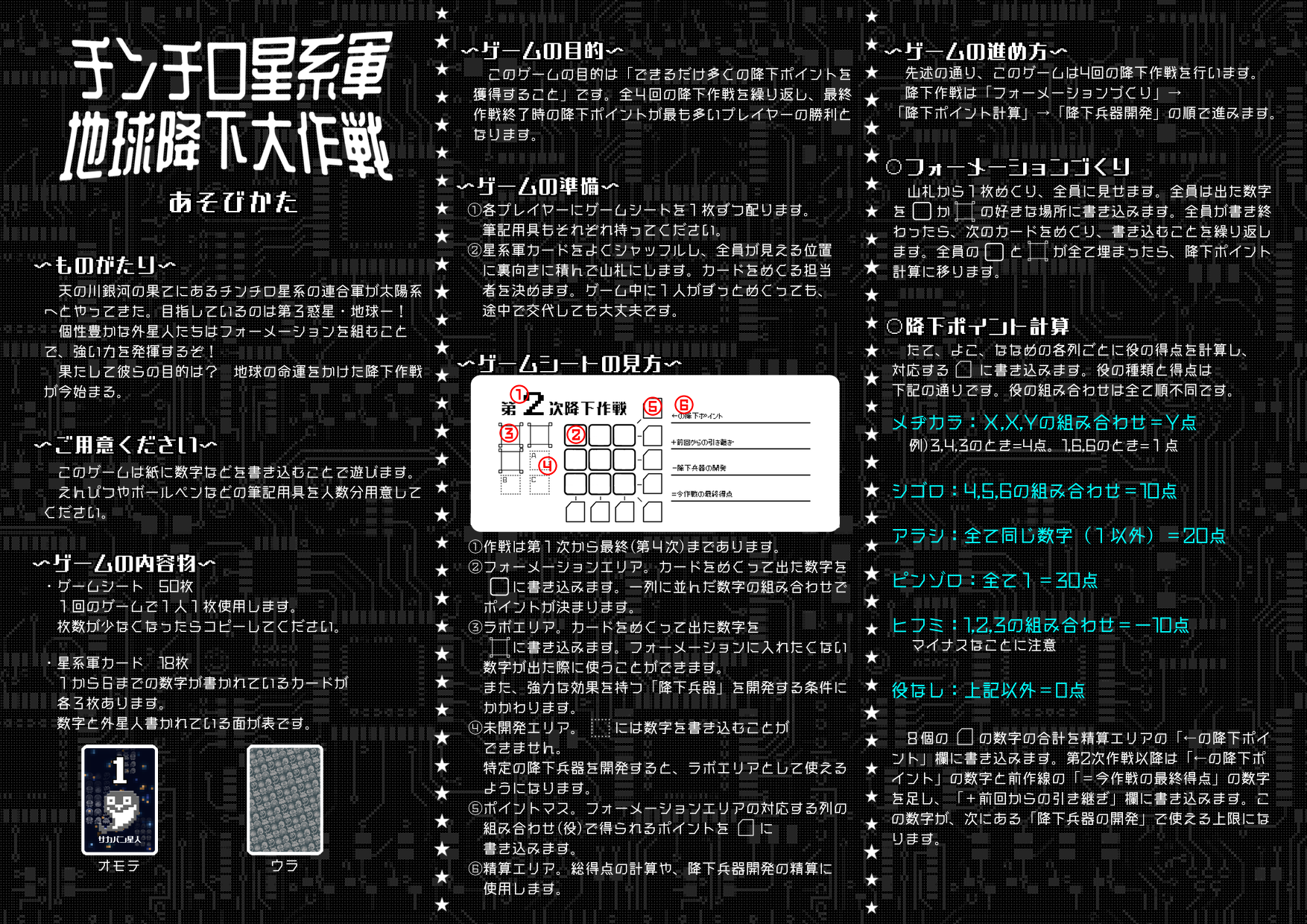 「チンチロ星系軍地球降下大作戦」は昔ながらのダイスゲーム「チンチロリン」と点数インフレ系ローグライトゲームを味わえる紙ペンゲームです。