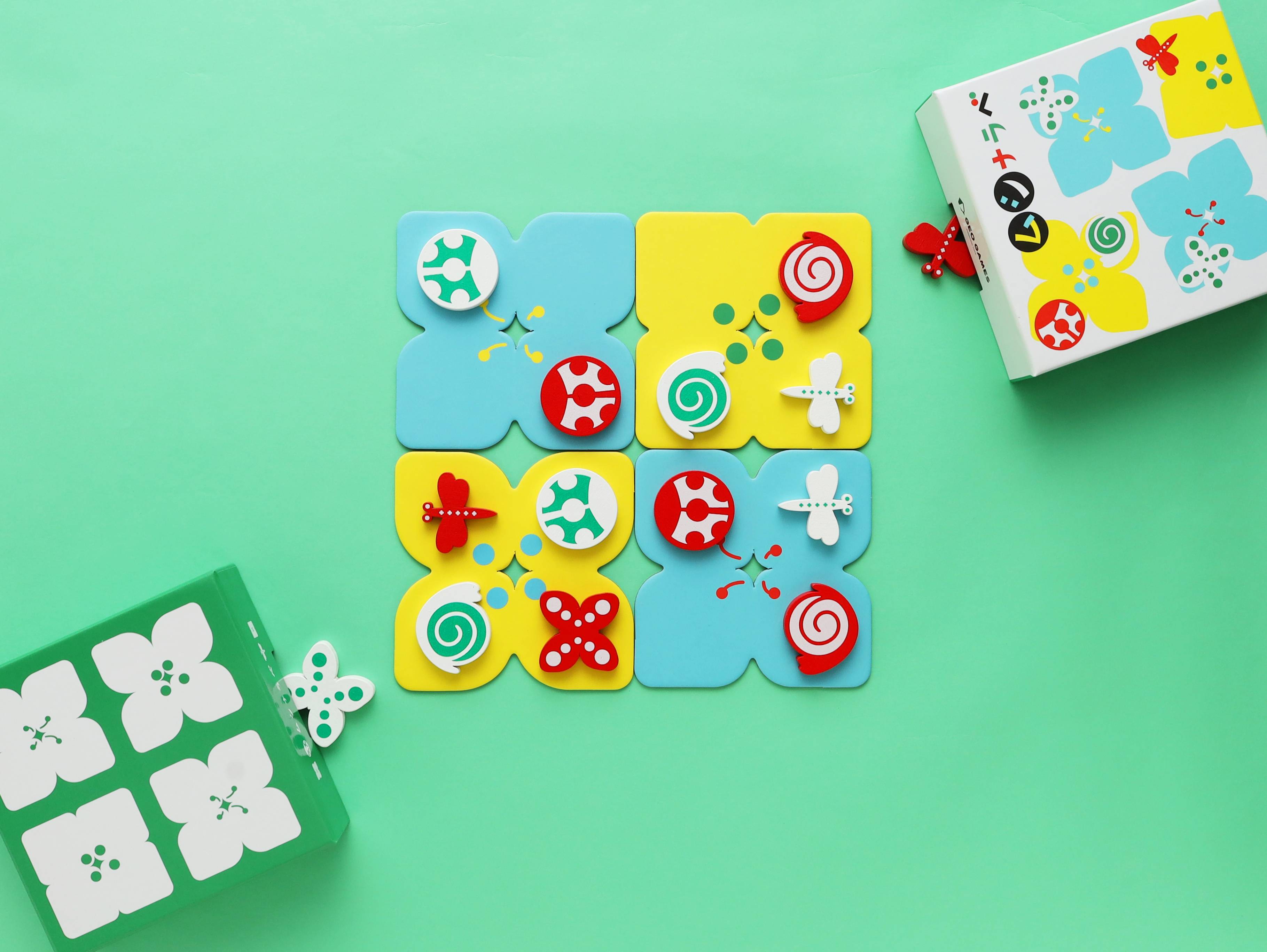 (例)チョウを置いたら、次のプレイヤーは置かれたチョウを軸に斜め方向のマスのどこかに置けます。